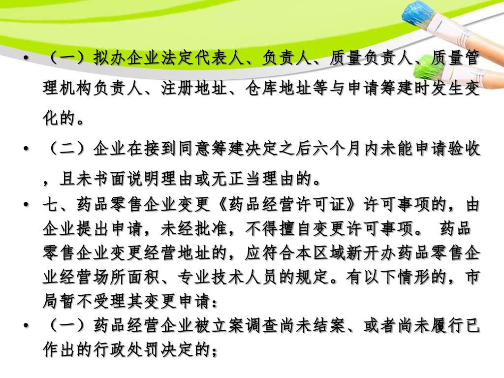 (一)拟办企业法定代表人、负责人、质量负责人、质量管理机构负责人、注册地址、仓库地址等与申请筹建时发生变化的。(一)拟办企业法定代表人、负责人、质量负责人、质量管理机构负责人、注册地址、仓库地址等与申请筹建时发生变化的。 (二)企业在接到同意筹建决定之后六个月内未能申请验收,且未书面说明理由或无正当理由的。 七、药品零售企业变更《药品经营许可证》许可事项的,由企业提出申请,未经批准,不得擅自变更许可事项。 药品零售企业变更经营地址的,应符合本区域新开办药品零售企业经营场所面积、专业技术人员的规定。有以下情形的,市局暂不受理其变更申请: (一)药品经营企业被立案调查尚未结案、或者尚未履行已作出的行政处罚决定的;