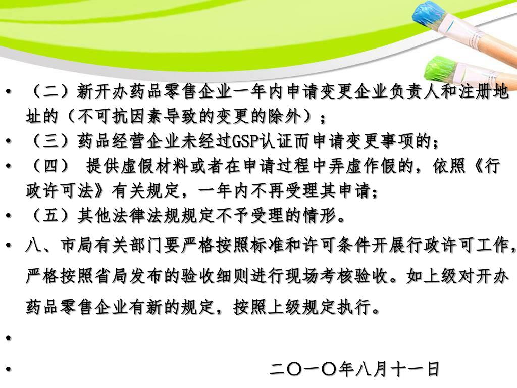 (二)新开办药品零售企业一年内申请变更企业负责人和注册地址的(不可抗因素导致的变更的除外);(二)新开办药品零售企业一年内申请变更企业负责人和注册地址的(不可抗因素导致的变更的除外); (三)药品经营企业未经过GSP认证而申请变更事项的; (四) 提供虚假材料或者在申请过程中弄虚作假的,依照《行政许可法》有关规定,一年内不再受理其申请; (五)其他法律法规规定不予受理的情形。 八、市局有关部门要严格按照标准和许可条件开展行政许可工作,严格按照省局发布的验收细则进行现场考核验收。如上级对开办药品零售企业有新的规定,按照上级规定执行。 二〇一〇年八月十一日
