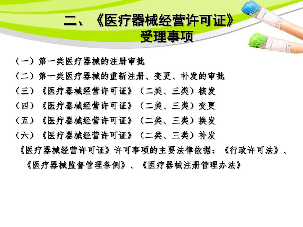 (一)第一类医疗器械的注册审批 (二)第一类医疗器械的重新注册、变更、补发的审批 (三)《医疗器械经营许可证》(二类、三类)核发 (四)《医疗器械经营许可证》(二类、三类)变更 (五)《医疗器械经营许可证》(二类、三类)换发 (六)《医疗器械经营许可证》(二类、三类)补发 《医疗器械经营许可证》许可事项的主要法律依据:《行政许可法》、《医疗器械监督管理条例》、《医疗器械注册管理办法》 二、《医疗器械经营许可证》 受理事项