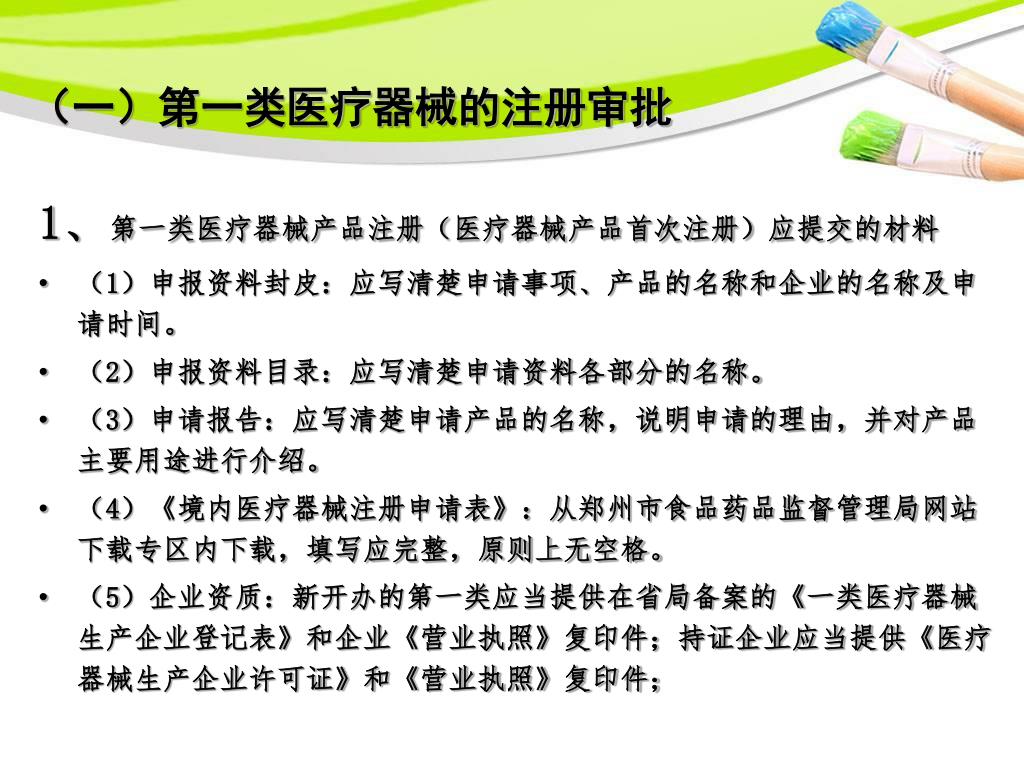 1、第一类医疗器械产品注册(医疗器械产品首次注册)应提交的材料1、第一类医疗器械产品注册(医疗器械产品首次注册)应提交的材料 (1)申报资料封皮:应写清楚申请事项、产品的名称和企业的名称及申请时间。 (2)申报资料目录:应写清楚申请资料各部分的名称。 (3)申请报告:应写清楚申请产品的名称,说明申请的理由,并对产品主要用途进行介绍。 (4)《境内医疗器械注册申请表》:从郑州市食品药品监督管理局网站下载专区内下载,填写应完整,原则上无空格。 (5)企业资质:新开办的第一类应当提供在省局备案的《一类医疗器械生产企业登记表》和企业《营业执照》复印件;持证企业应当提供《医疗器械生产企业许可证》和《营业执照》复印件; (一)第一类医疗器械的注册审批