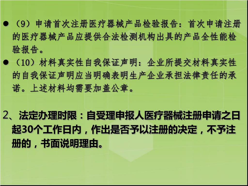 (9)申请首次注册医疗器械产品检验报告:首次申请注册的医疗器械产品应提供合法检测机构出具的产品全性能检验报告。(9)申请首次注册医疗器械产品检验报告:首次申请注册的医疗器械产品应提供合法检测机构出具的产品全性能检验报告。 (10)材料真实性自我保证声明:企业所提交材料真实性的自我保证声明应当明确表明生产企业承担法律责任的承诺。上述材料均需要加盖公章。 2、法定办理时限:自受理申报人医疗器械注册申请之日起30个工作日内,作出是否予以注册的决定,不予注册的,书面说明理由。