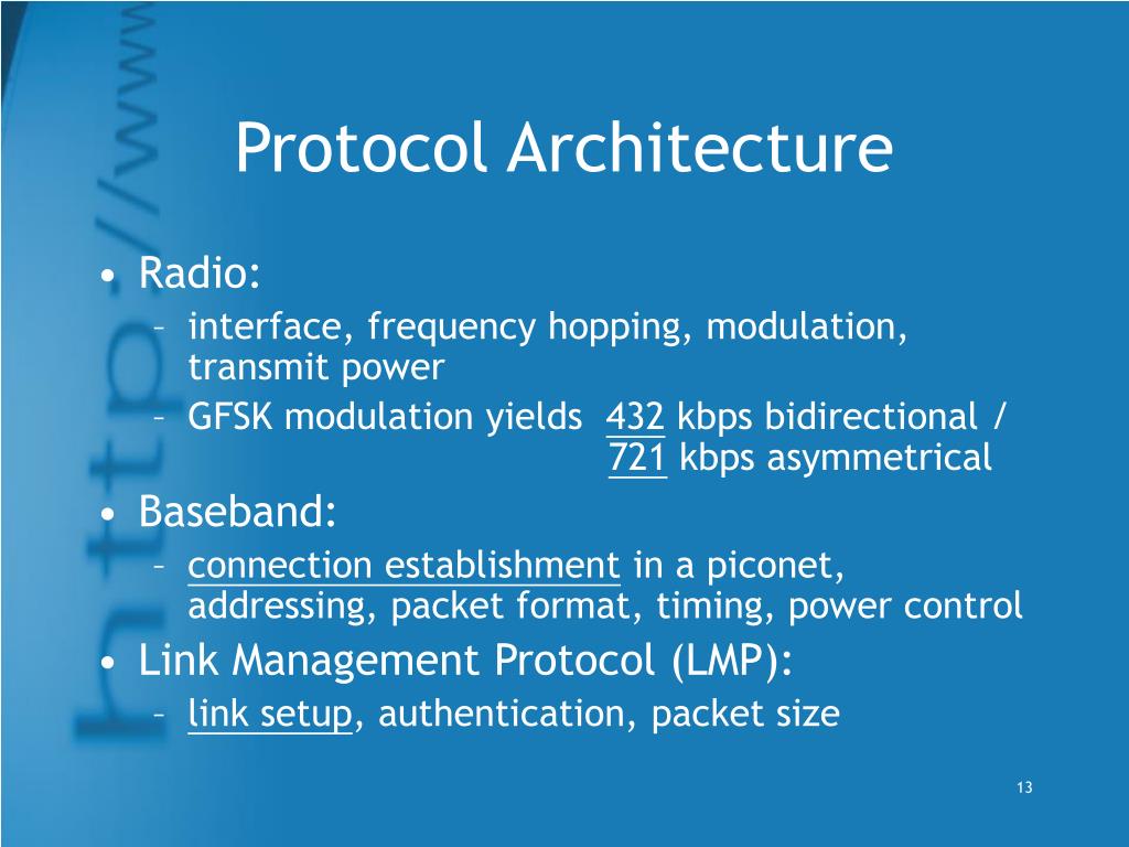 Protocol Architecture • Radio: • interface, frequency hopping, modulation, transmit power • GFSK modulation yields 432 kbps bidirectional / 721 kbps asymmetrical • Baseband: • connection establishment in a piconet, addressing, packet format, timing, power control • Link Management Protocol (LMP): • link setup, authentication, packet size