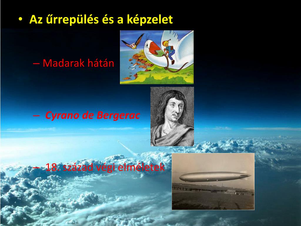 Az űrrepülés és a képzelet • Madarak hátán • Cyrano de Bergerac • 18. század végi elméletek