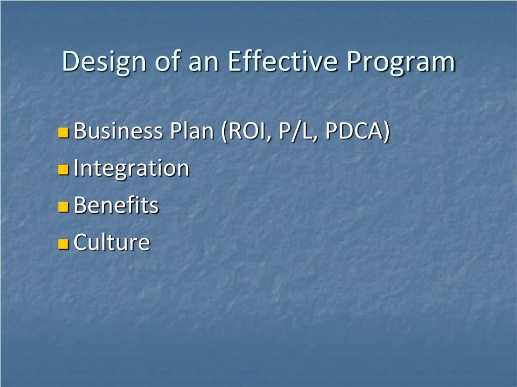 Design of an Effective Program • Business Plan (ROI, P/L, PDCA) • Integration • Benefits • Culture