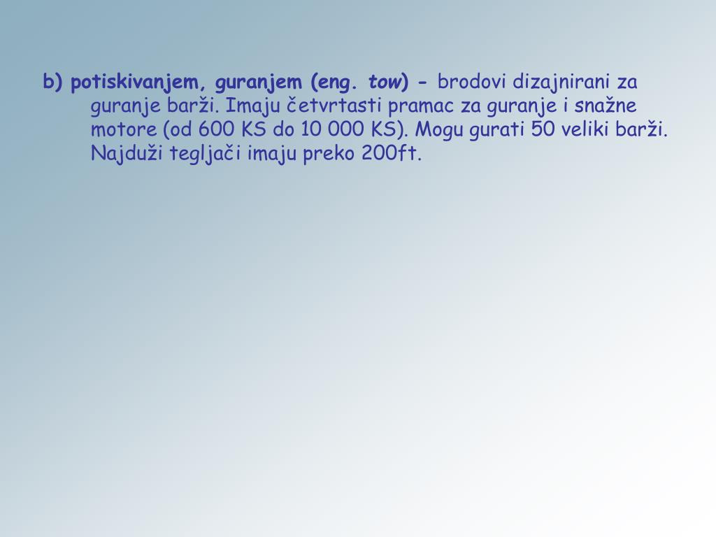 b) potiskivanjem, guranjem (eng. tow) - brodovi dizajnirani za guranje barži. Imaju četvrtasti pramac za guranje i snažne motore (od 600 KS do 10 000 KS). Mogu gurati 50 veliki barži. Najduži tegljači imaju preko 200ft.