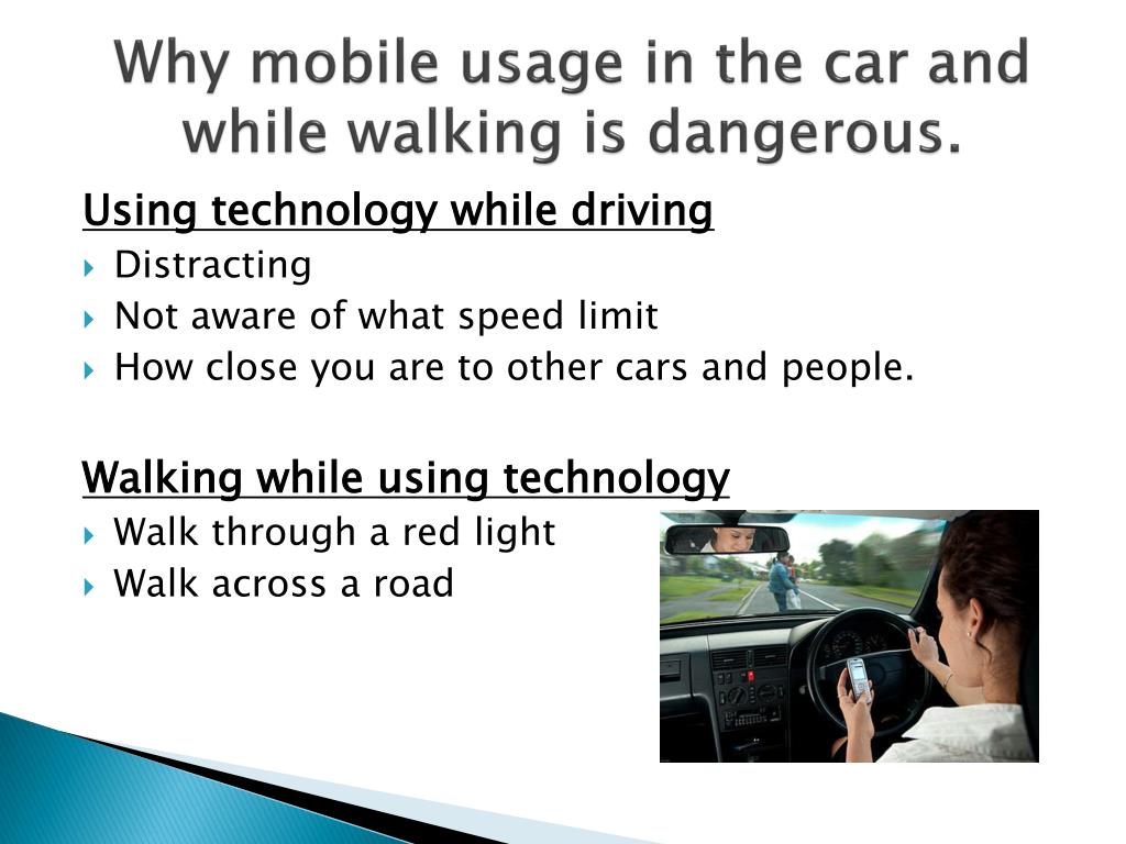 Why mobile usage in the car and while walking is dangerous. Using technology while driving • Distracting • Not aware of what speed limit • How close you are to other cars and people. Walking while using technology • Walk through a red light • Walk across a road