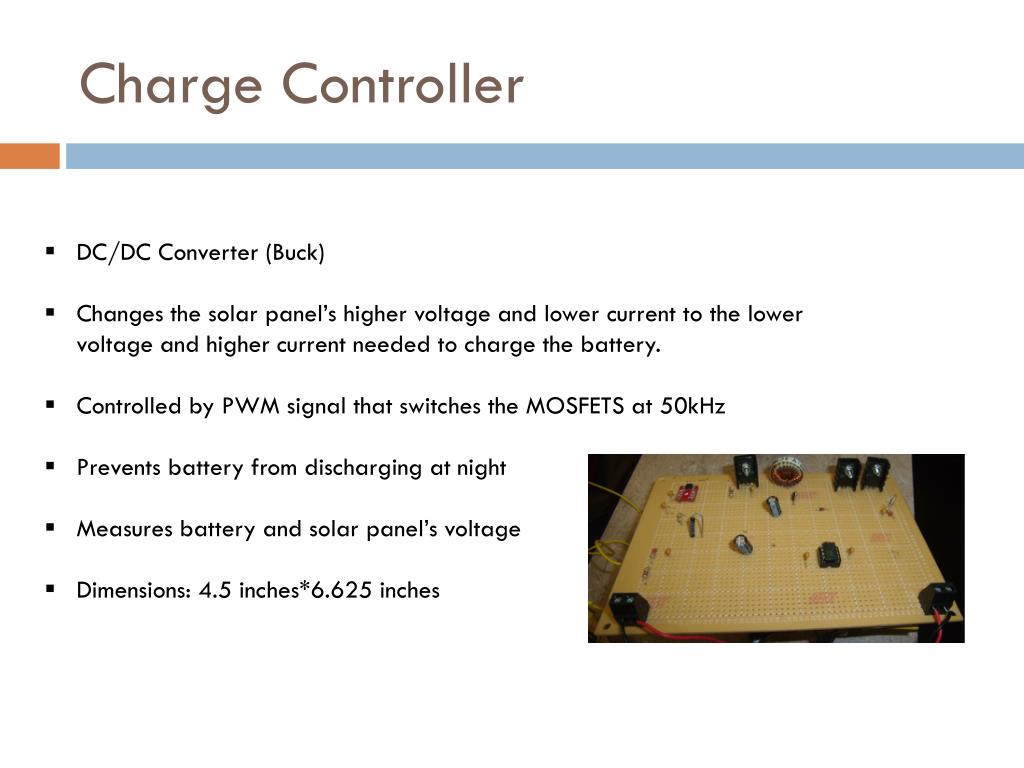 Charge Controller • DC/DC Converter (Buck) • Changes the solar panel’s higher voltage and lower current to the lower voltage and higher current needed to charge the battery. • Controlled by PWM signal that switches the MOSFETS at 50kHz • Prevents battery from discharging at night • Measures battery and solar panel’s voltage • Dimensions: 4.5 inches*6.625 inches