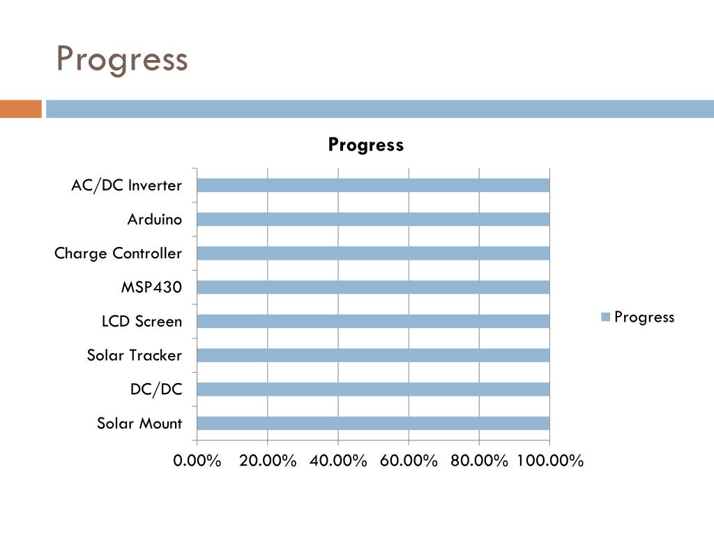 Specifications and Requirements • Convert 12 V DC to 120 V AC at 60Hz • Capable of supplying 5 V DC at 500mA for USB outputs • The efficiency (Input power from solar panel to output power from outlet devices) should be at least 90 percent • An MPPT algorithm that works very well to keep the solar panel operating at its maximum power point (MPP) • Horizontal rotation for solar panel mount (solar tracking)