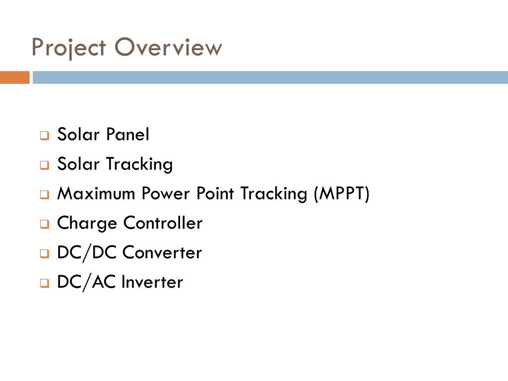 Project Overview • Solar Panel • Solar Tracking • Maximum Power Point Tracking (MPPT) • Charge Controller • DC/DC Converter • DC/AC Inverter