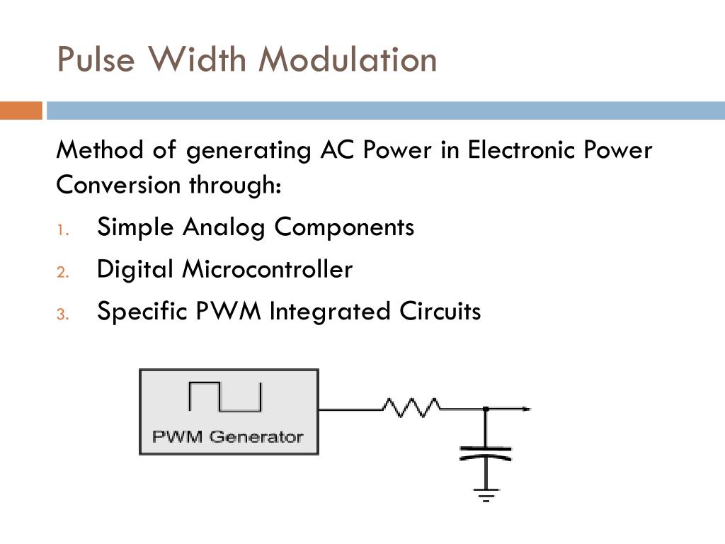 Pulse Width Modulation Method of generating AC Power in Electronic Power Conversion through: • Simple Analog Components • Digital Microcontroller • Specific PWM Integrated Circuits
