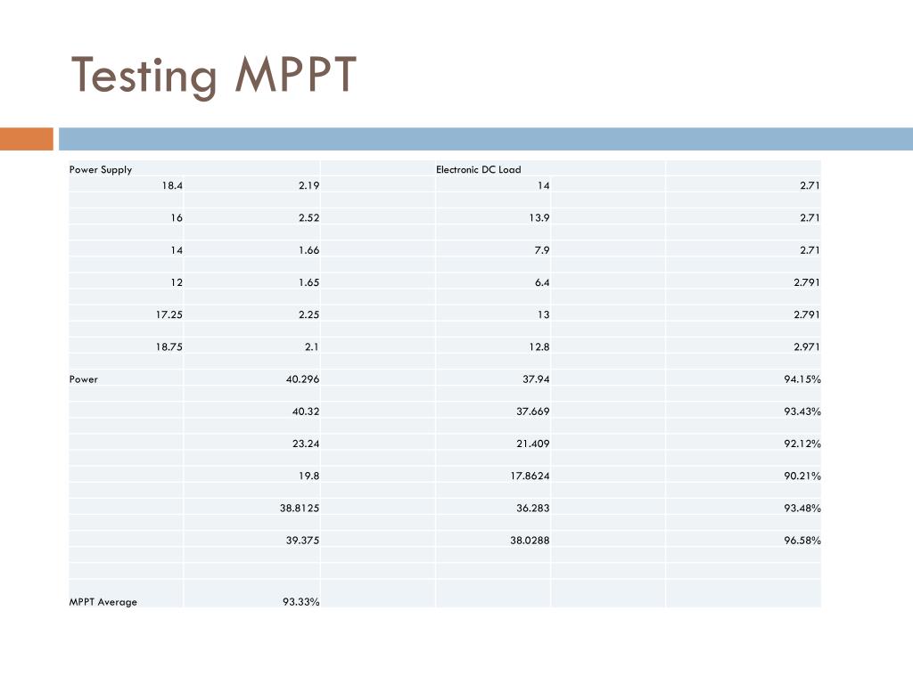 Maximum Power Point Tracking (MPPT)Algorithms Perturb and Observe: • Most commonly used because of its ease of implementation • Modifies the operating voltage or current of the photovoltaic panel until maximum power can be obtained Incremental Conductance: • Take advantage of the fact that the slope of the power-voltage curve is zero at the maximum power point - The slope of the power voltage curve is positive at the left of the MPP and negative at the right of the MPP • MPP is found by comparing the instantaneous conductance (I/V) to the incremental conductance (ΔI/ΔV) • When MPP is obtained, the solar module maintains this power unless a change in ΔI occurs.