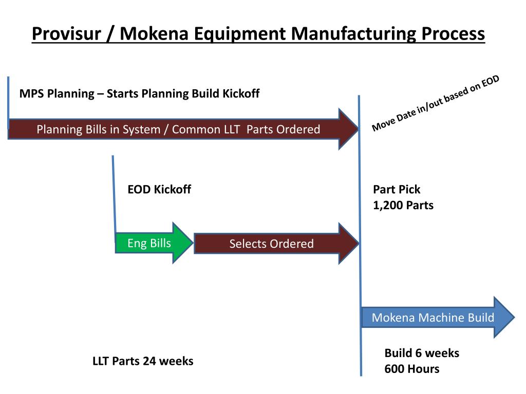 Provisur / Mokena Equipment Manufacturing Process. MPS Planning – Starts Planning Build Kickoff. Move Date in/out based on EOD. Planning Bills in System / Common LLT Parts Ordered. EOD Kickoff. Part Pick 1,200 Parts. Eng Bills. Selects Ordered. Mokena Machine Build. Build 6 weeks
