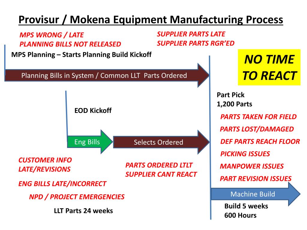 Provisur / Mokena Equipment Manufacturing Process SUPPLIER PARTS LATE SUPPLIER PARTS RGR’ED MPS WRONG / LATE PLANNING BILLS NOT RELEASED MPS Planning – Starts Planning Build Kickoff NO TIME TO REACT Planning Bills in System / Common LLT Parts Ordered Part Pick 1,200 Parts EOD Kickoff PARTS TAKEN FOR FIELD PARTS LOST/DAMAGED Eng Bills Selects Ordered DEF PARTS REACH FLOOR PICKING ISSUES CUSTOMER INFO LATE/REVISIONS PARTS ORDERED LTLT SUPPLIER CANT REACT MANPOWER ISSUES PART REVISION ISSUES ENG BILLS LATE/INCORRECT Machine Build NPD / PROJECT EMERGENCIES Build 5 weeks 600 Hours LLT Parts 24 weeks