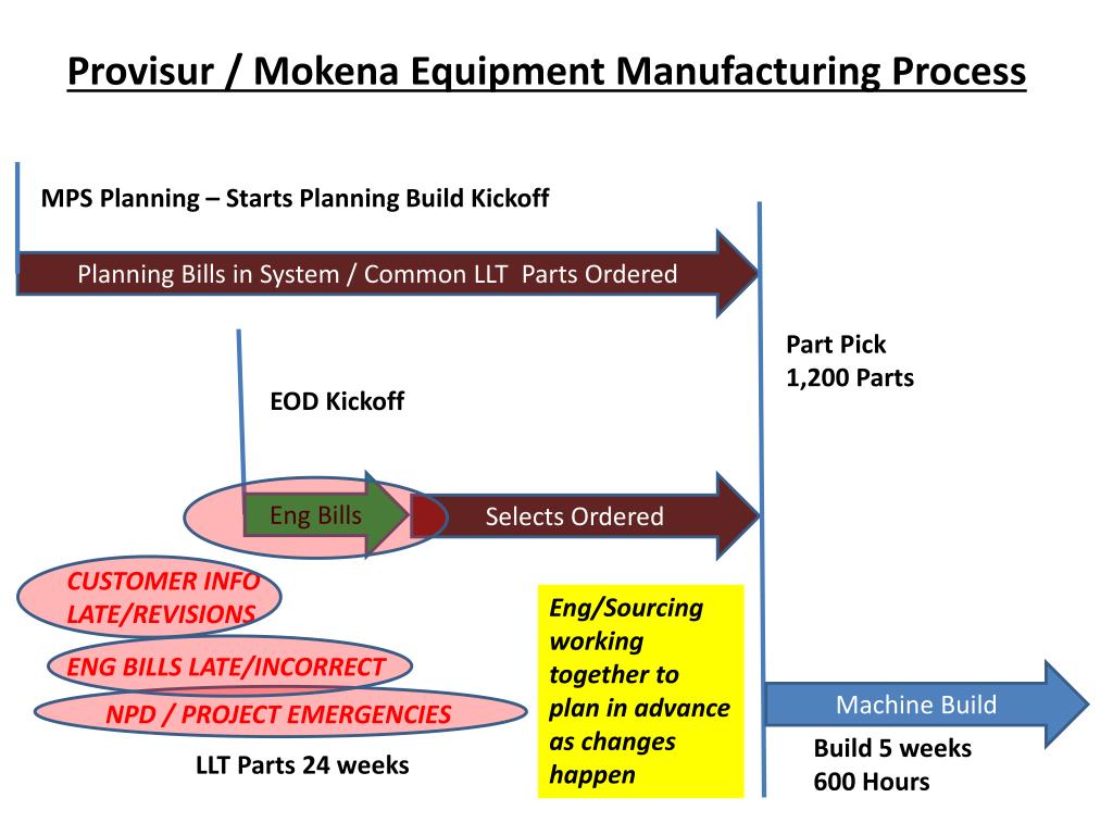 Provisur / Mokena Equipment Manufacturing Process MPS Planning – Starts Planning Build Kickoff Planning Bills in System / Common LLT Parts Ordered Part Pick 1,200 Parts EOD Kickoff Eng Bills Selects Ordered CUSTOMER INFO LATE/REVISIONS Eng/Sourcing working together to plan in advance as changes happen ENG BILLS LATE/INCORRECT Machine Build NPD / PROJECT EMERGENCIES Build 5 weeks 600 Hours LLT Parts 24 weeks
