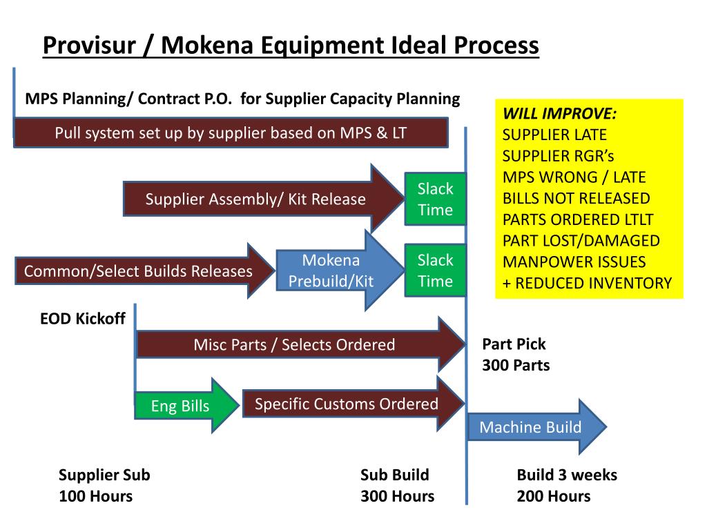 Provisur / Mokena Equipment Ideal Process MPS Planning/ Contract P.O. for Supplier Capacity Planning WILL IMPROVE: SUPPLIER LATE SUPPLIER RGR’s MPS WRONG / LATE BILLS NOT RELEASED PARTS ORDERED LTLT PART LOST/DAMAGED MANPOWER ISSUES + REDUCED INVENTORY Pull system set up by supplier based on MPS & LT Supplier Assembly/ Kit Release Slack Time Mokena Prebuild/Kit Common/Select Builds Releases Slack Time EOD Kickoff Misc Parts / Selects Ordered Part Pick 300 Parts Specific Customs Ordered Eng Bills Machine Build Supplier Sub 100 Hours Sub Build 300 Hours Build 3 weeks 200 Hours