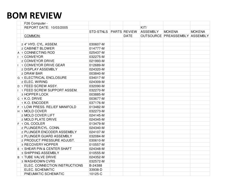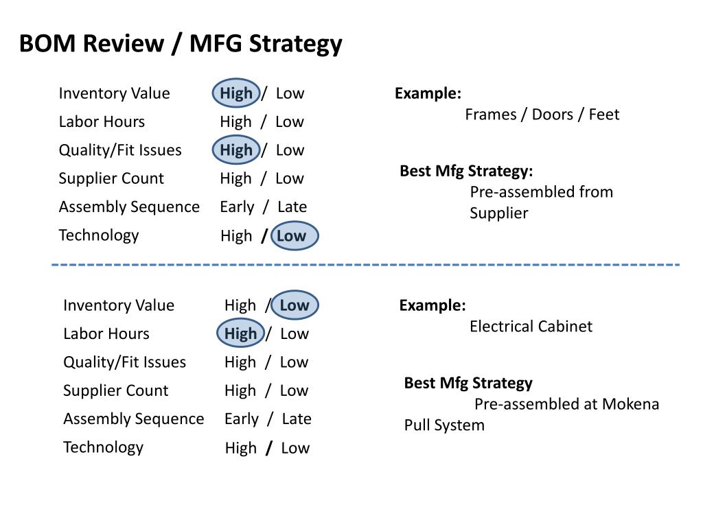 BOM Review / MFG Strategy High / Low Inventory Value Example: Frames / Doors / Feet High / Low Labor Hours High / Low Quality/Fit Issues Best Mfg Strategy: Pre-assembled from Supplier High / Low Supplier Count Early / Late Assembly Sequence Technology High / Low High/ Low Inventory Value Example: Electrical Cabinet High / Low Labor Hours High / Low Quality/Fit Issues Best Mfg Strategy Pre-assembled at Mokena Pull System High / Low Supplier Count Early / Late Assembly Sequence Technology High / Low