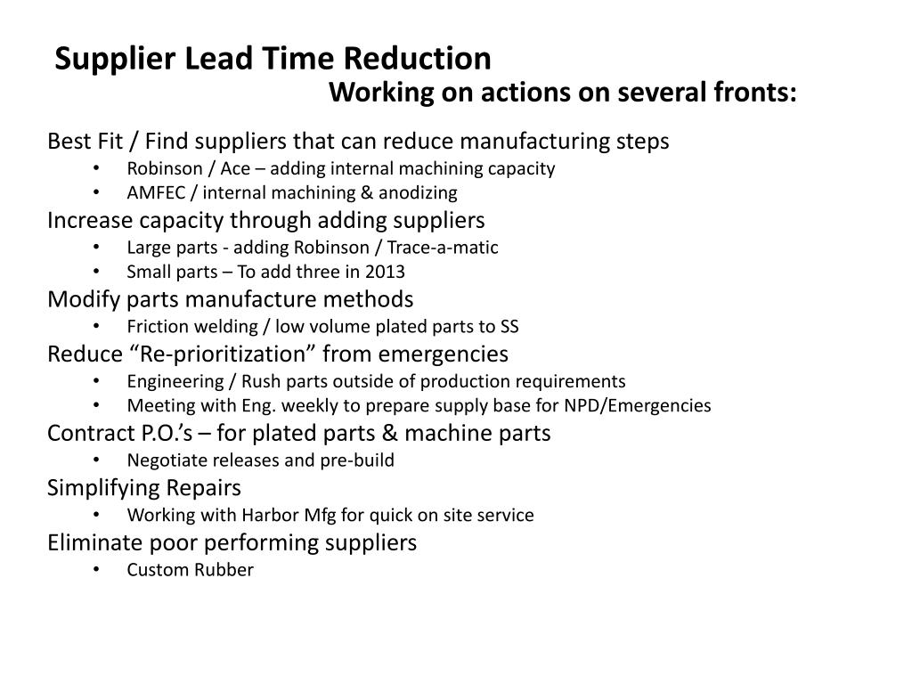 Supplier Lead Time Reduction Working on actions on several fronts: • Best Fit / Find suppliers that can reduce manufacturing steps • Robinson / Ace – adding internal machining capacity • AMFEC / internal machining & anodizing • Increase capacity through adding suppliers • Large parts - adding Robinson / Trace-a-matic • Small parts – To add three in 2013 • Modify parts manufacture methods • Friction welding / low volume plated parts to SS • Reduce “Re-prioritization” from emergencies • Engineering / Rush parts outside of production requirements • Meeting with Eng. weekly to prepare supply base for NPD/Emergencies • Contract P.O.’s – for plated parts & machine parts • Negotiate releases and pre-build • Simplifying Repairs • Working with Harbor Mfg for quick on site service • Eliminate poor performing suppliers • Custom Rubber