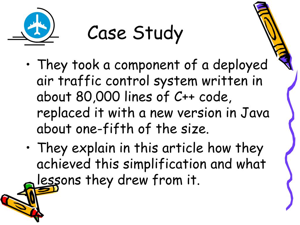 Case Study • They took a component of a deployed air traffic control system written in about 80,000 lines of C++ code, replaced it with a new version in Java about one-fifth of the size. • They explain in this article how they achieved this simplification and what lessons they drew from it.