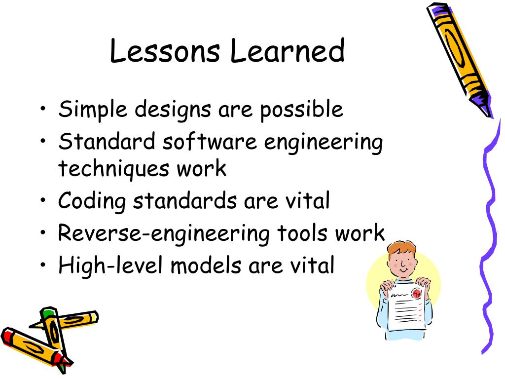 Lessons Learned • Simple designs are possible • Standard software engineering techniques work • Coding standards are vital • Reverse-engineering tools work • High-level models are vital