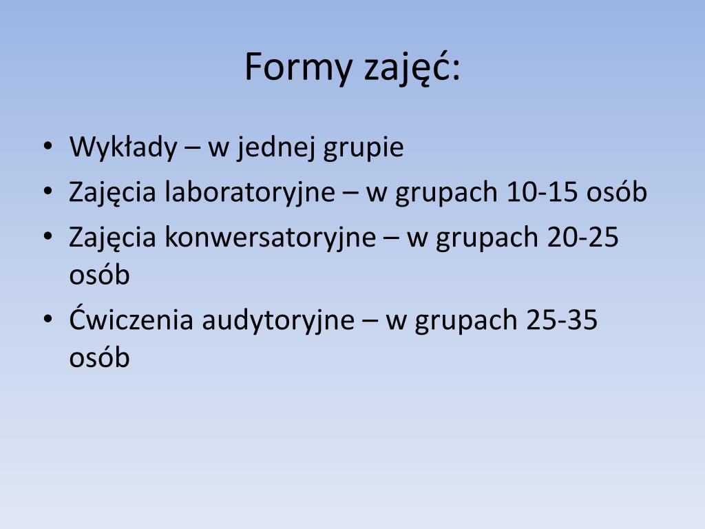 Formy zajęć: • Wykłady – w jednej grupie • Zajęcia laboratoryjne – w grupach 10-15 osób • Zajęcia konwersatoryjne – w grupach 20-25 osób • Ćwiczenia audytoryjne – w grupach 25-35 osób