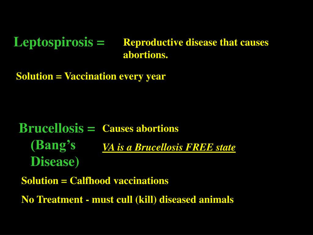 Reproductive disease that causes abortions. Solution = Vaccination every year Leptospirosis = Brucellosis = (Bang’s Disease) Causes abortions VA is a Brucellosis FREE state Solution = Calfhood vaccinations No Treatment - must cull (kill) diseased animals