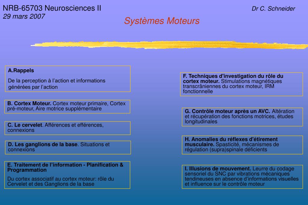 NRB-65703 Neurosciences II 29 mars 2007 Dr C. Schneider Systèmes Moteurs • Rappels • De la perception à l’action et informations générées par l’action F. Techniques d'investigation du rôle du cortex moteur. Stimulations magnétiques transcrâniennes du cortex moteur, IRM fonctionnelle B. Cortex Moteur. Cortex moteur primaire, Cortex pré-moteur, Aire motrice supplémentaire G. Contrôle moteur après un AVC. Altération et récupération des fonctions motrices, études longitudinales C. Le cervelet. Afférences et efférences, connexions H. Anomalies du réflexes d'étirement musculaire. Spasticité, mécanismes de régulation (supra)spinale déficients D. Les ganglions de la base. Situations et connexions E. Traitement de l’information - Planification & Programmation Du cortex associatif au cortex moteur: rôle du Cervelet et des Ganglions de la base I. Illusions de mouvement. Leurre du codage sensoriel du SNC par vibrations mécaniques tendineuses en absence d’informations visuelles et influence sur le contrôle moteur