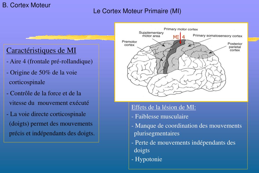 Caractéristiques de MI - Aire 4 (frontale pré-rollandique) - Origine de 50% de la voie corticospinale - Contrôle de la force et de la vitesse du mouvement exécuté - La voie directe corticospinale (doigts) permet des mouvements précis et indépendants des doigts. Effets de la lésion de MI: - Faiblesse musculaire - Manque de coordination des mouvements plurisegmentaires - Perte de mouvements indépendants des doigts - Hypotonie MI 4 B. Cortex Moteur Le Cortex Moteur Primaire (MI)