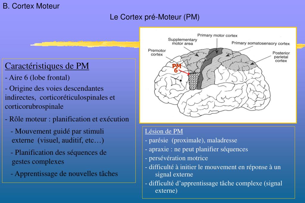 Caractéristiques de PM - Aire 6 (lobe frontal) - Origine des voies descendantes indirectes, corticoréticulospinales et corticorubrospinale - Rôle moteur : planification et exécution - Mouvement guidé par stimuli externe (visuel, auditif, etc…) - Planification des séquences de gestes complexes - Apprentissage de nouvelles tâches Lésion de PM - parésie (proximale), maladresse - apraxie : ne peut planifier séquences - persévération motrice - difficulté à initier le mouvement en réponse à un signal externe - difficulté d’apprentissage tâche complexe (signal externe) PM 6 B. Cortex Moteur Le Cortex pré-Moteur (PM)