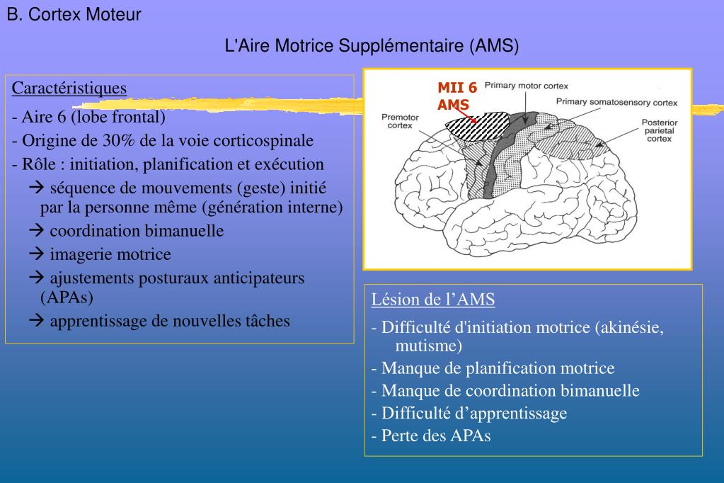Caractéristiques - Aire 6 (lobe frontal) - Origine de 30% de la voie corticospinale - Rôle : initiation, planification et exécution séquence de mouvements (geste) initié par la personne même (génération interne) coordination bimanuelle imagerie motrice ajustements posturaux anticipateurs (APAs) apprentissage de nouvelles tâches Lésion de l’AMS - Difficulté d'initiation motrice (akinésie, mutisme) - Manque de planification motrice - Manque de coordination bimanuelle - Difficulté d’apprentissage - Perte des APAs MII 6 AMS B. Cortex Moteur L'Aire Motrice Supplémentaire (AMS)
