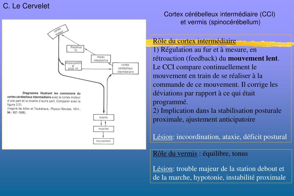C. Le Cervelet Cortex cérébelleux intermédiaire (CCI) et vermis (spinocérébellum) Rôle du cortex intermédiaire 1) Régulation au fur et à mesure, en rétroaction (feedback) du mouvement lent. Le CCI compare continuellement le mouvement en train de se réaliser à la commande de ce mouvement. Il corrige les déviations par rapport à ce qui était programmé. 2) Implication dans la stabilisation posturale proximale, ajustement anticipatoire Lésion: incoordination, ataxie, déficit postural Rôle du vermis : équilibre, tonus Lésion: trouble majeur de la station debout et de la marche, hypotonie, instabilité proximale