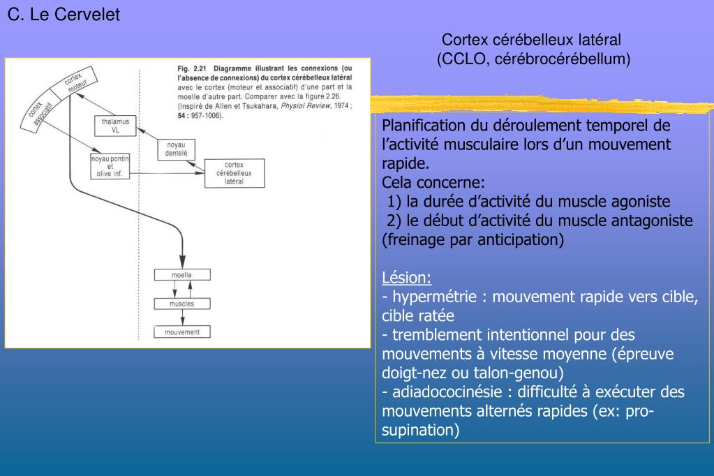 C. Le Cervelet Cortex cérébelleux latéral (CCLO, cérébrocérébellum) Planification du déroulement temporel de l’activité musculaire lors d’un mouvement rapide. Cela concerne: 1) la durée d’activité du muscle agoniste 2) le début d’activité du muscle antagoniste (freinage par anticipation) Lésion: - hypermétrie : mouvement rapide vers cible, cible ratée - tremblement intentionnel pour des mouvements à vitesse moyenne (épreuve doigt-nez ou talon-genou) - adiadococinésie : difficulté à exécuter des mouvements alternés rapides (ex: pro-supination)