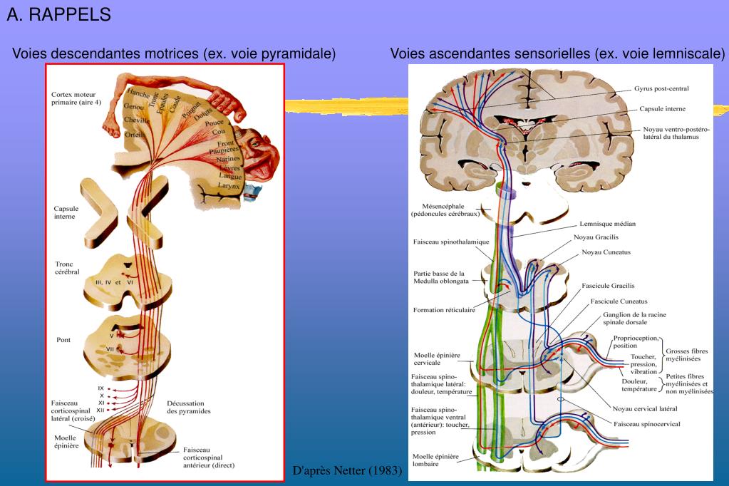 A. RAPPELS Voies descendantes motrices (ex. voie pyramidale) Voies ascendantes sensorielles (ex. voie lemniscale) D'après Netter (1983)
