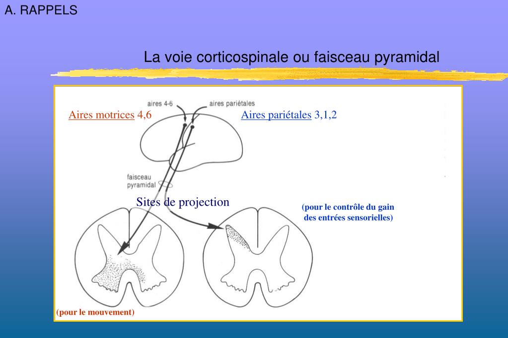 A. RAPPELS La voie corticospinale ou faisceau pyramidal Aires pariétales 3,1,2 Aires motrices 4,6 Sites de projection (pour le contrôle du gain des entrées sensorielles) (pour le mouvement)