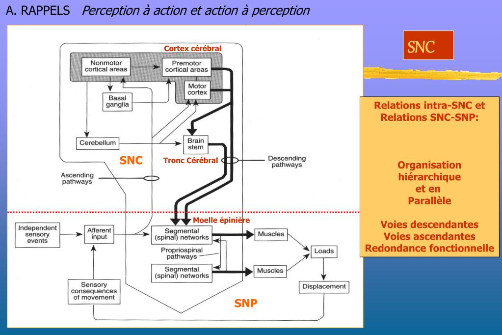 A. RAPPELS Perception à action et action à perception SNC Cortex cérébral Relations intra-SNC et Relations SNC-SNP: Organisation hiérarchique et en Parallèle Voies descendantes Voies ascendantes Redondance fonctionnelle SNC Tronc Cérébral Moelle épinière SNP