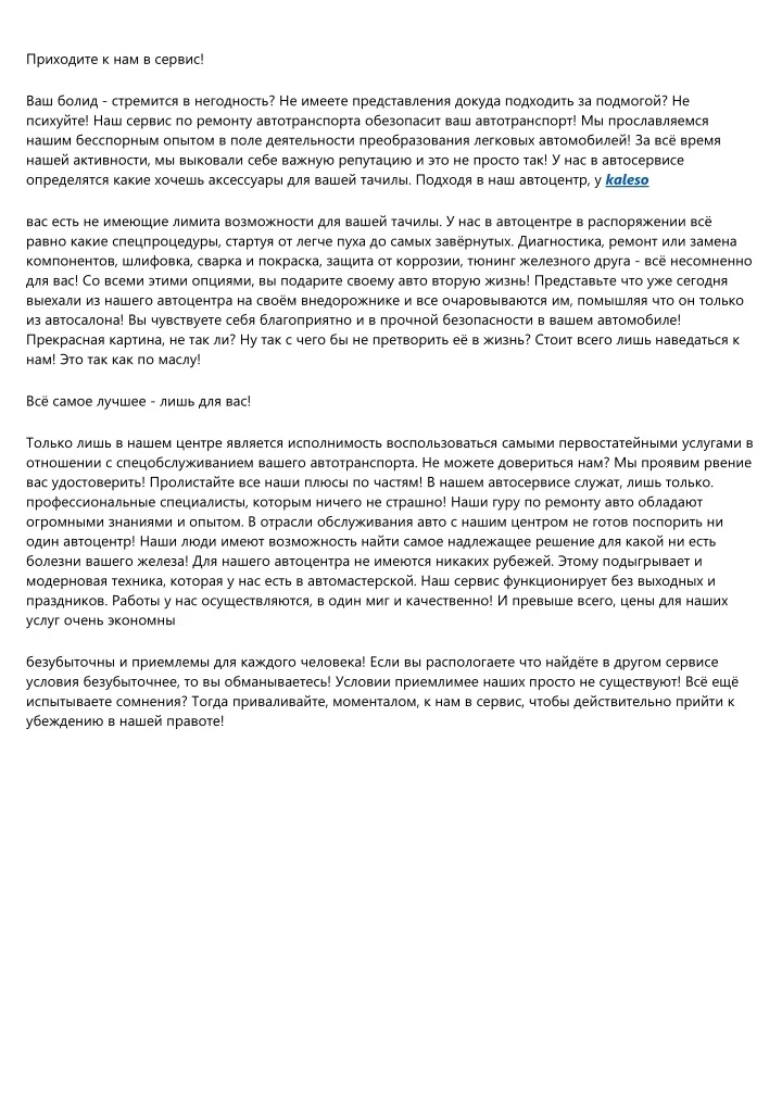 Приходите к нам в сервис! Ваш болид - стремится в негодность? Не имеете представления докуда подходить за подмогой? Не психуйте! Наш сервис по ремонту автотранспорта обезопасит ваш автотранспорт! Мы прославляемся нашим бесспорным опытом в поле деятельности преобразования легковых автомобилей! За всё время нашей активности, мы выковали себе важную репутацию и это не просто так! У нас в автосервисе определятся какие хочешь аксессуары для вашей тачилы. Подходя в наш автоцентр, у kaleso вас есть не имеющие лимита возможности для вашей тачилы. У нас в автоцентре в распоряжении всё равно какие спецпроцедуры, стартуя от легче пуха до самых завёрнутых. Диагностика, ремонт или замена компонентов, шлифовка, сварка и покраска, защита от коррозии, тюнинг железного друга - всё несомненно для вас! Со всеми этими опциями, вы подарите своему авто вторую жизнь! Представьте что уже сегодня выехали из нашего автоцентра на своём внедорожнике и все очаровываются им, помышляя что он только из автосалона! Вы чувствуете себя благоприятно и в прочной безопасности в вашем автомобиле! Прекрасная картина, не так ли? Ну так с чего бы не претворить её в жизнь? Стоит всего лишь наведаться к нам! Это так как по маслу! Всё самое лучшее - лишь для вас! Только лишь в нашем центре является исполнимость воспользоваться самыми первостатейными услугами в отношении с спецобслуживанием вашего автотранспорта. Не можете довериться нам? Мы проявим рвение вас удостоверить! Пролистайте все наши плюсы по частям! В нашем автосервисе служат, лишь только. профессиональные специалисты, которым ничего не страшно! Наши гуру по ремонту авто обладают огромными знаниями и опытом. В отрасли обслуживания авто с нашим центром не готов поспорить ни один автоцентр! Наши люди имеют возможность найти самое надлежащее решение для какой ни есть болезни вашего железа! Для нашего автоцентра не имеются никаких рубежей. Этому подыгрывает и модерновая техника, которая у нас есть в автомастерской. Наш сервис функционирует без выходных и праздников. Работы у нас осуществляются, в один миг и качественно! И превыше всего, цены для наших услуг очень экономны безубыточны и приемлемы для каждого человека! Если вы распологаете что найдёте в другом сервисе условия безубыточнее, то вы обманываетесь! Условии приемлимее наших просто не существуют! Всё ещё испытываете сомнения? Тогда приваливайте, моменталом, к нам в сервис, чтобы действительно прийти к убеждению в нашей правоте!