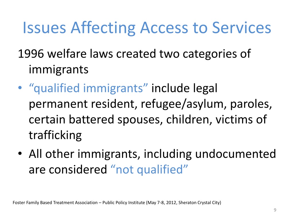 Issues Affecting Access to Services 1996 welfare laws created two categories of immigrants • “qualified immigrants” include legal permanent resident, refugee/asylum, paroles, certain battered spouses, children, victims of trafficking • All other immigrants, including undocumented are considered “not qualified” Foster Family Based Treatment Association – Public Policy Institute (May 7-8, 2012, Sheraton Crystal City)