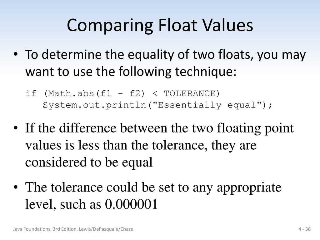 Comparing Float Values • To determine the equality of two floats, you may want to use the following technique: if (Math.abs(f1 - f2) < TOLERANCE) System.out.println("Essentially equal"); • If the difference between the two floating point values is less than the tolerance, they are considered to be equal • The tolerance could be set to any appropriate level, such as 0.000001 Java Foundations, 3rd Edition, Lewis/DePasquale/Chase