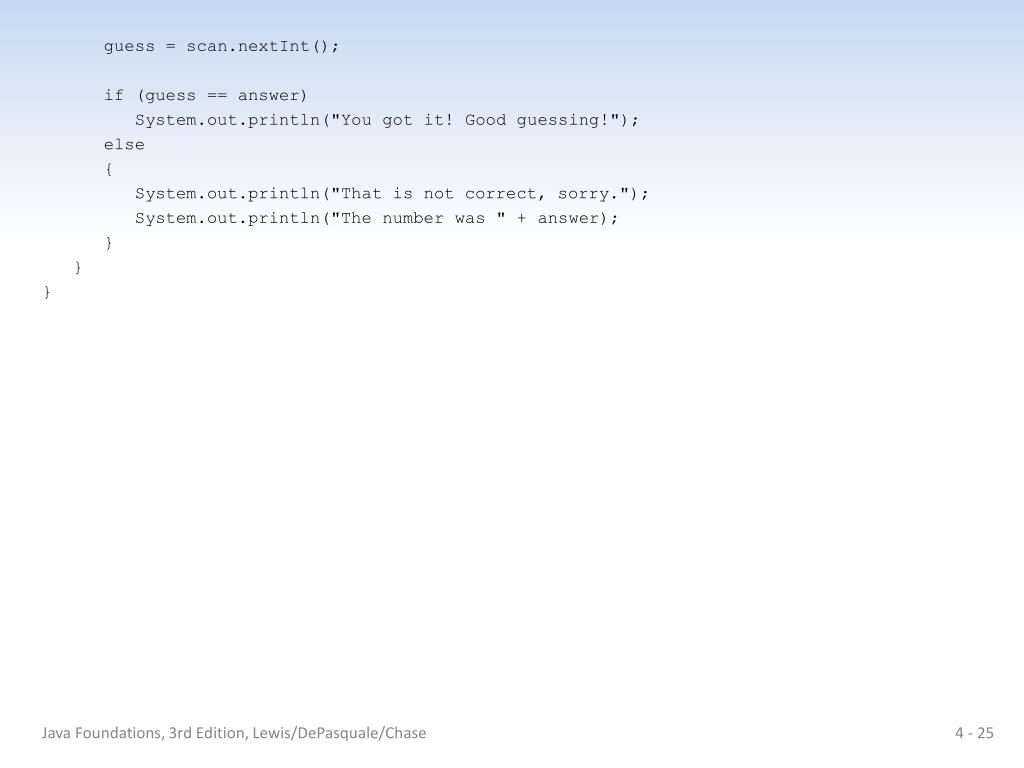 guess = scan.nextInt(); if (guess == answer) System.out.println("You got it! Good guessing!"); else { System.out.println("That is not correct, sorry."); System.out.println("The number was " + answer); } } } Java Foundations, 3rd Edition, Lewis/DePasquale/Chase