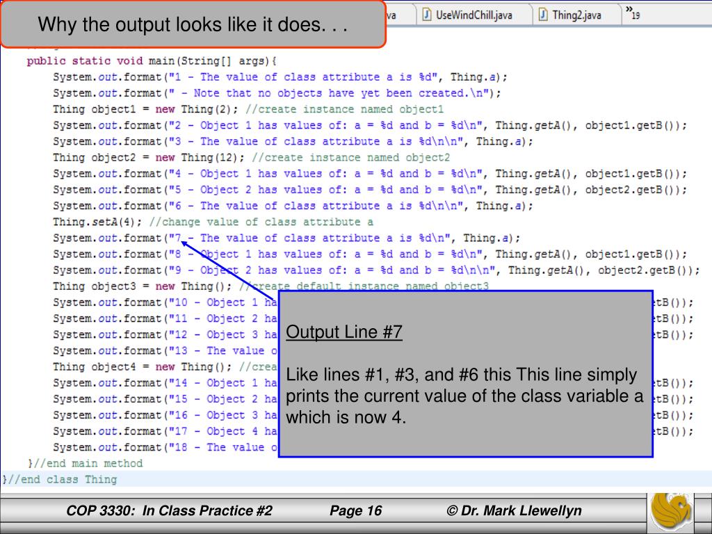 Why the output looks like it does. . . Output Line #3 Like line #1, this line simply prints the current value of the class variable a which is still 5.