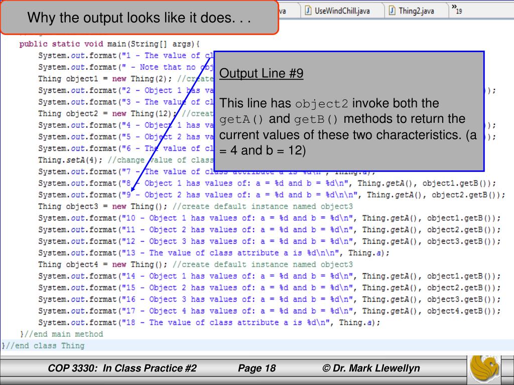 Why the output looks like it does. . . Output Line #15 This line has object2 invoke both the getA() and getB() methods to return the current values of these two characteristics. (a = 4 and b = 12)