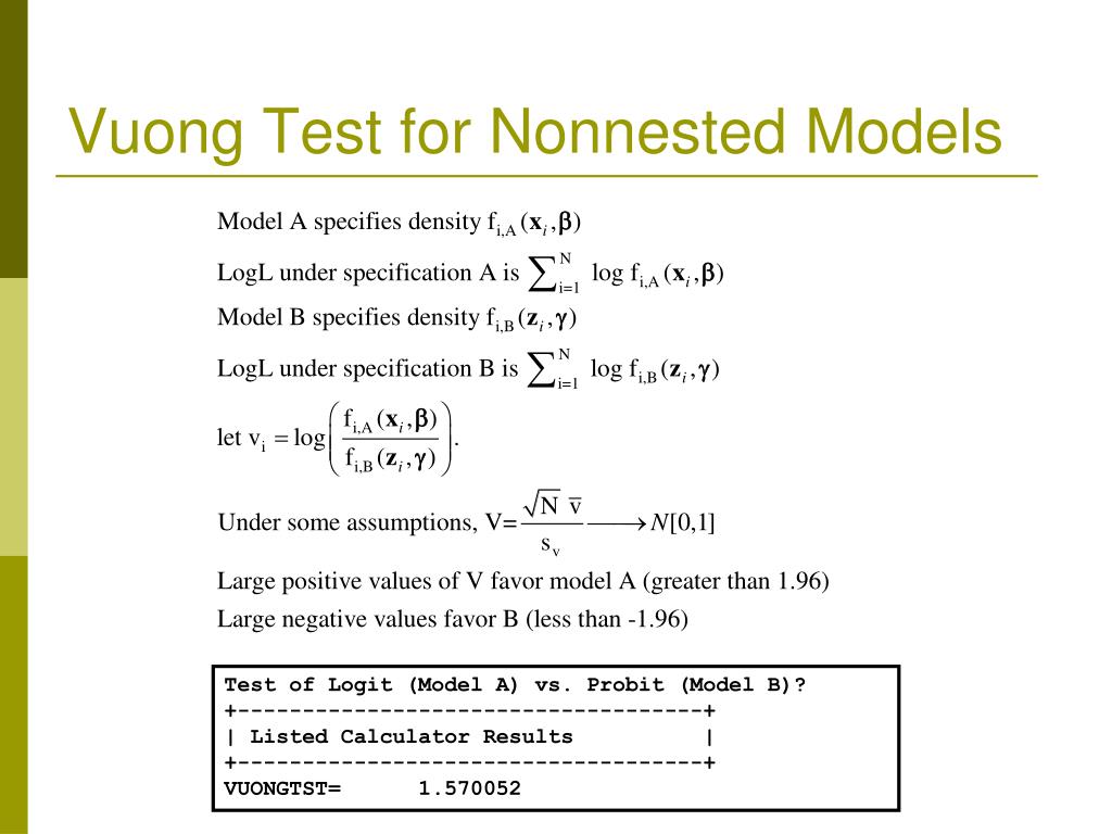 Vuong Test for Nonnested Models Test of Logit (Model A) vs. Probit (Model B)? +------------------------------------+ | Listed Calculator Results | +------------------------------------+ VUONGTST= 1.570052