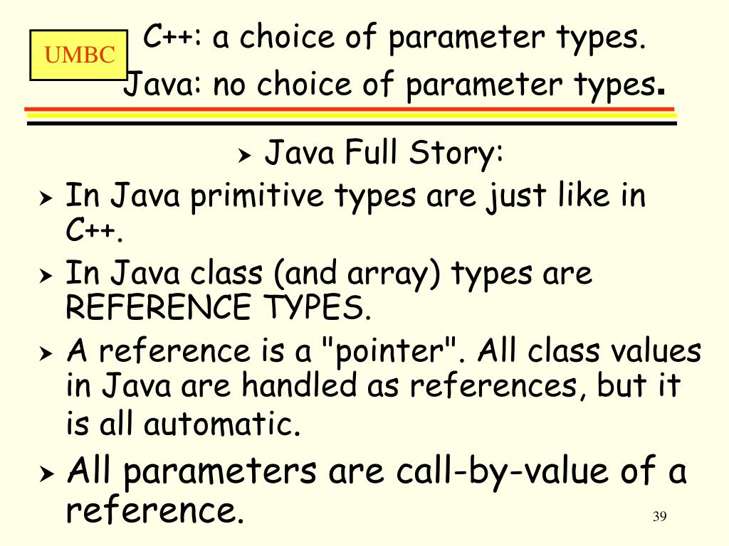 C++: a choice of parameter types.Java: no choice of parameter types. • Java Full Story: • In Java primitive types are just like in C++. • In Java class (and array) types are REFERENCE TYPES. • A reference is a "pointer". All class values in Java are handled as references, but it is all automatic. • All parameters are call-by-value of a reference.