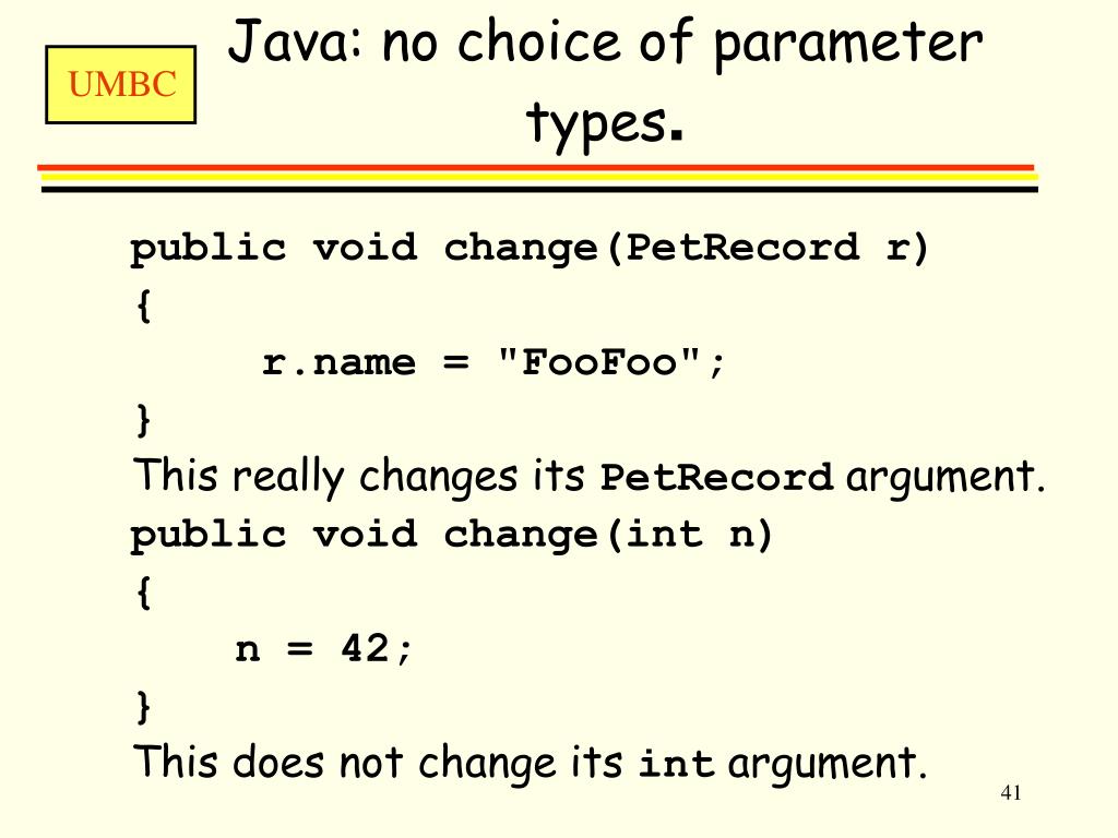 Java: no choice of parameter types. public void change(PetRecord r) { r.name = "FooFoo"; } This really changes its PetRecord argument. public void change(int n) { n = 42; } This does not change its int argument.