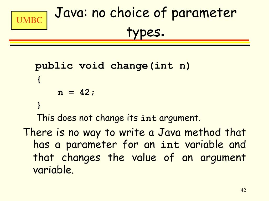 Java: no choice of parameter types. public void change(int n) { n = 42; } This does not change its int argument. There is no way to write a Java method that has a parameter for an int variable and that changes the value of an argument variable.