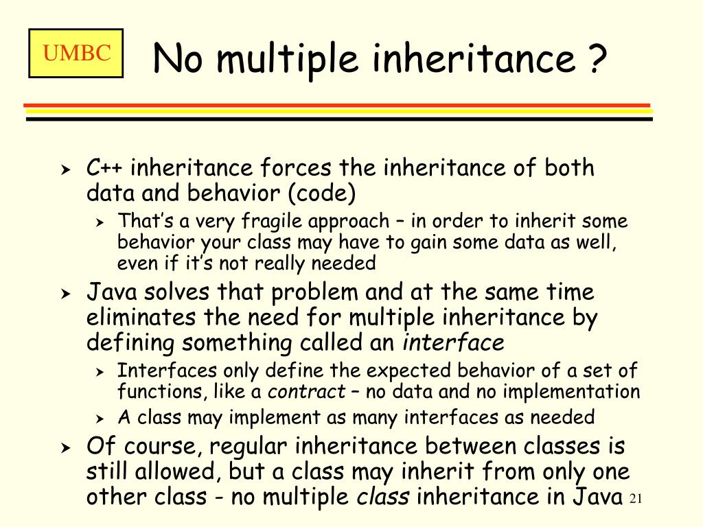 No multiple inheritance ? • C++ inheritance forces the inheritance of both data and behavior (code) • That’s a very fragile approach – in order to inherit some behavior your class may have to gain some data as well, even if it’s not really needed • Java solves that problem and at the same time eliminates the need for multiple inheritance by defining something called an interface • Interfaces only define the expected behavior of a set of functions, like a contract – no data and no implementation • A class may implement as many interfaces as needed • Of course, regular inheritance between classes is still allowed, but a class may inherit from only one other class - no multiple class inheritance in Java