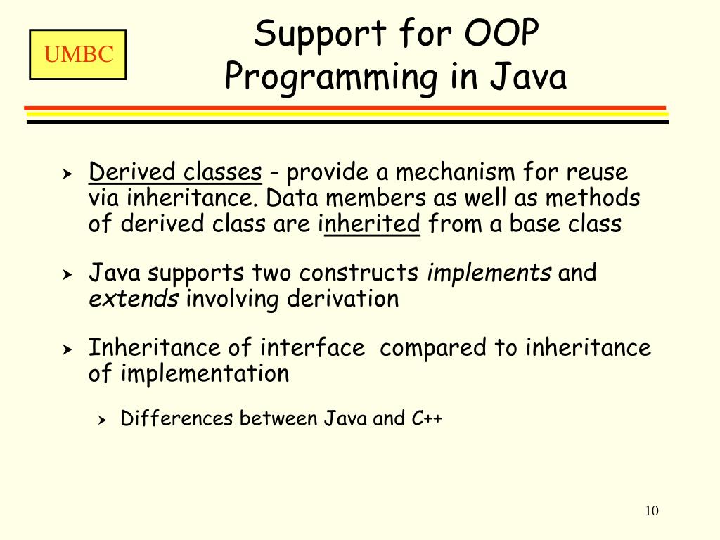Support for OOP Programming in Java • Derived classes - provide a mechanism for reuse via inheritance. Data members as well as methods of derived class are inherited from a base class • Java supports two constructs implements and extends involving derivation • Inheritance of interface compared to inheritance of implementation • Differences between Java and C++