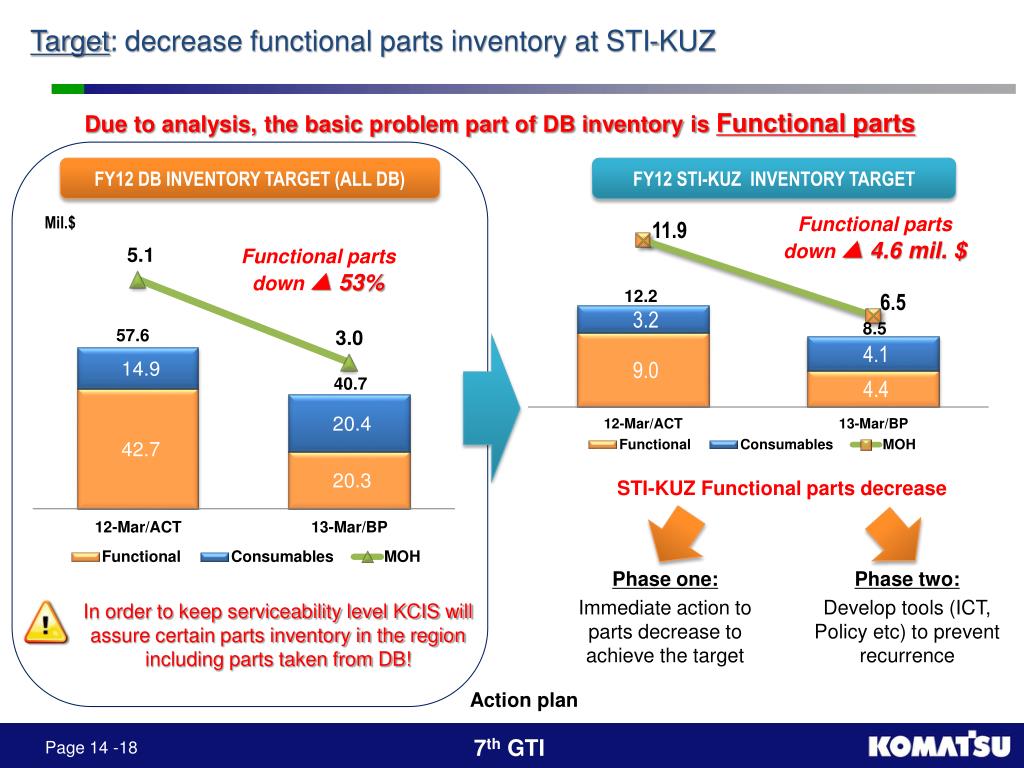 Target: decrease functional parts inventory at STI-KUZ Due to analysis, the basic problem part of DB inventory is Functional parts FY12 DB INVENTORY TARGET (ALL DB) FY12 STI-KUZ INVENTORY TARGET Mil.$ Functional parts down ▲ 4.6 mil. $ Functional parts down ▲ 53% 12.2 8.5 57.6 40.7 STI-KUZ Functional parts decrease Phase one: Immediate action to parts decrease to achieve the target Phase two: Develop tools (ICT, Policy etc) to prevent recurrence In order to keep serviceability level KCIS will assure certain parts inventory in the region including parts taken from DB! Action plan