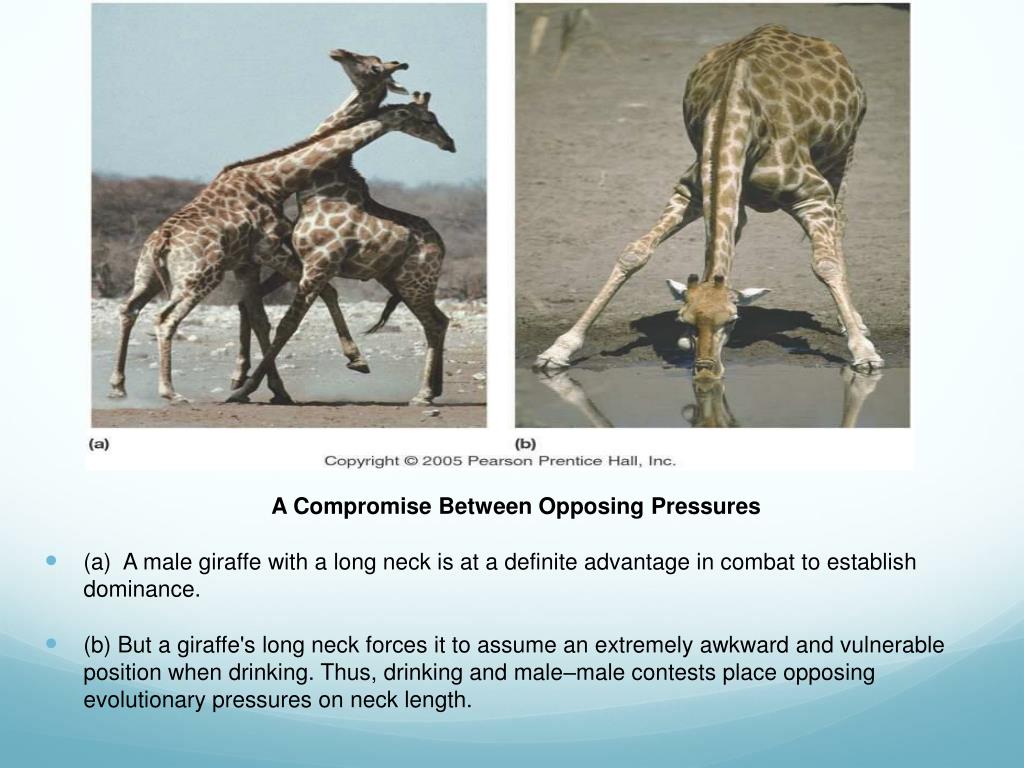 A Compromise Between Opposing Pressures • (a) A male giraffe with a long neck is at a definite advantage in combat to establish dominance. • (b) But a giraffe's long neck forces it to assume an extremely awkward and vulnerable position when drinking. Thus, drinking and male–male contests place opposing evolutionary pressures on neck length.