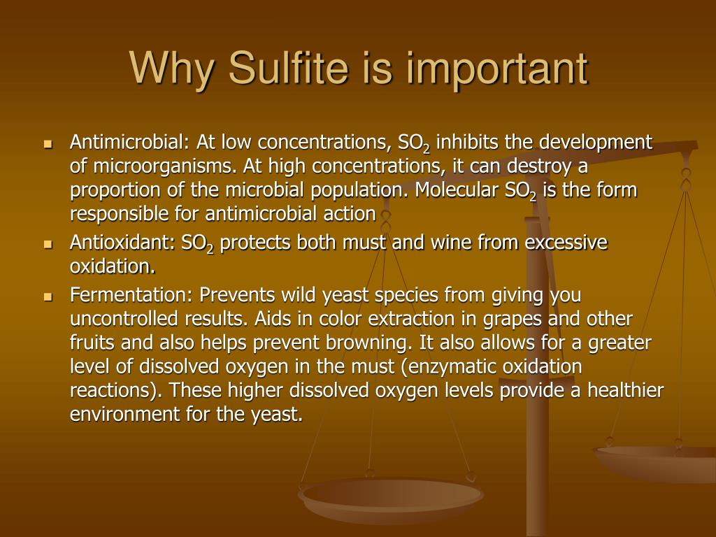 Why Sulfite is important • Antimicrobial: At low concentrations, SO2 inhibits the development of microorganisms. At high concentrations, it can destroy a proportion of the microbial population. Molecular SO2 is the form responsible for antimicrobial action • Antioxidant:SO2 protects both must and wine from excessive oxidation. • Fermentation: Prevents wild yeast species from giving you uncontrolled results. Aids in color extraction in grapes and other fruits and also helps prevent browning. It also allows for a greater level of dissolved oxygen in the must (enzymatic oxidation reactions). These higher dissolved oxygen levels provide a healthier environment for the yeast.