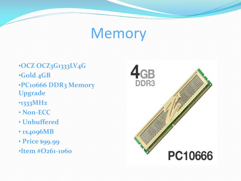 Memory OCZ OCZ3G1333LV4G Gold 4GB PC10666 DDR3 Memory Upgrade 1333MHz Non-ECC Unbuffered 1x4096MB Price $99.99 Item #O261-1060